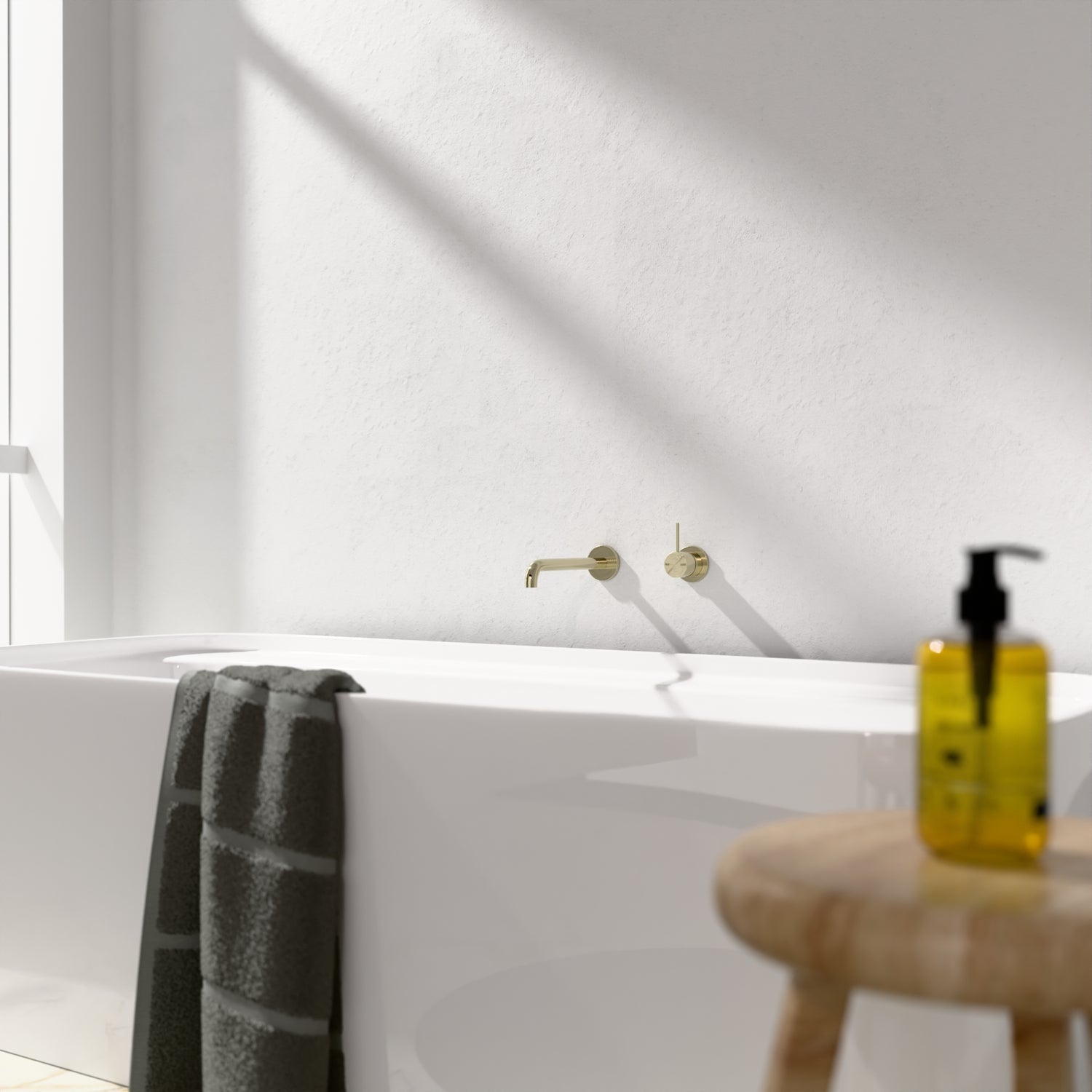 Mecca Wall Basin Mixer Separate Back Plate Handle Up 185mm Spout Brushed Gold is backordered and will ship as soon as it is back in stock.