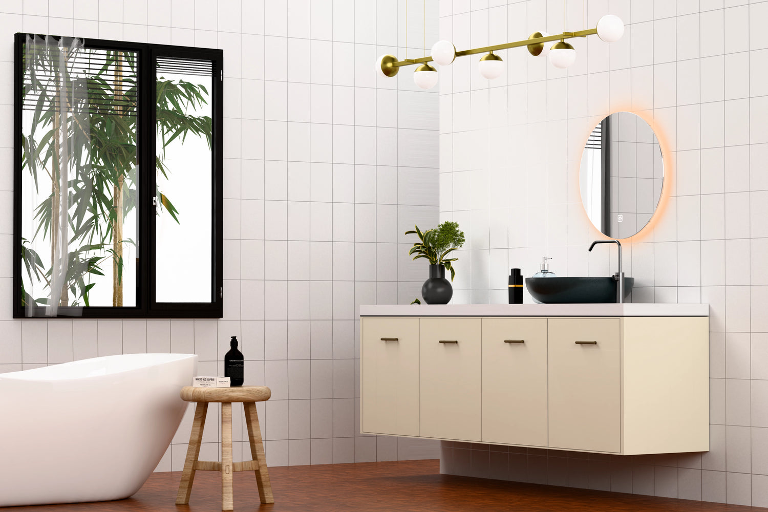 • One-touch sensor: LED + demister, 0–100 % dimming, 30 s–60 min timer